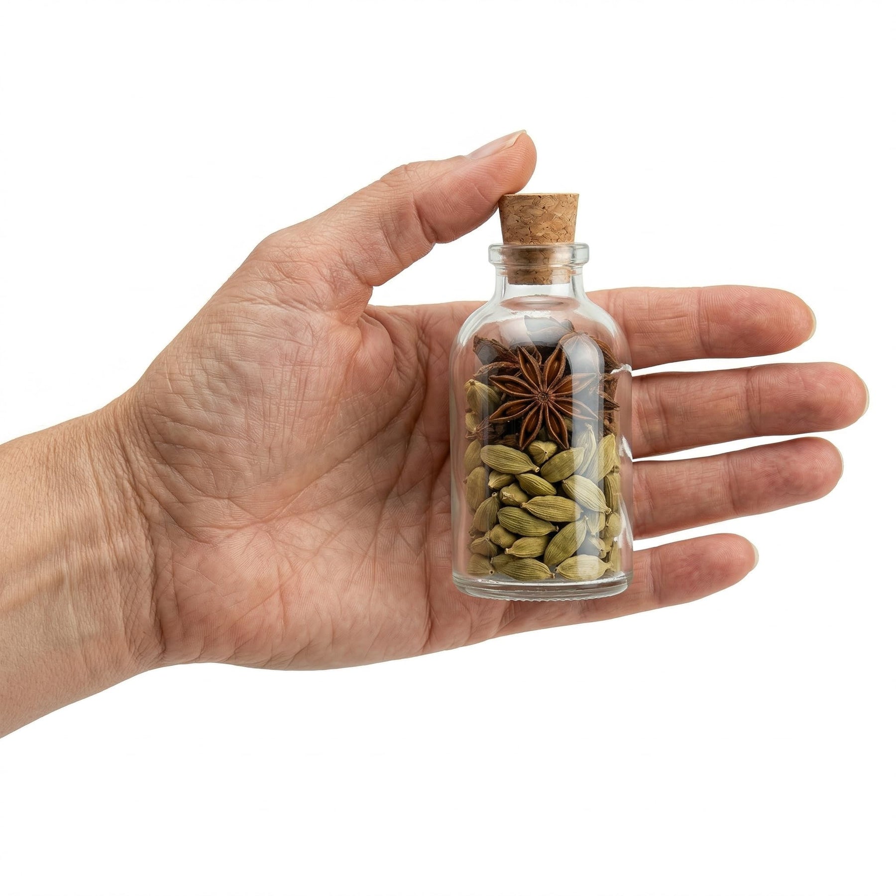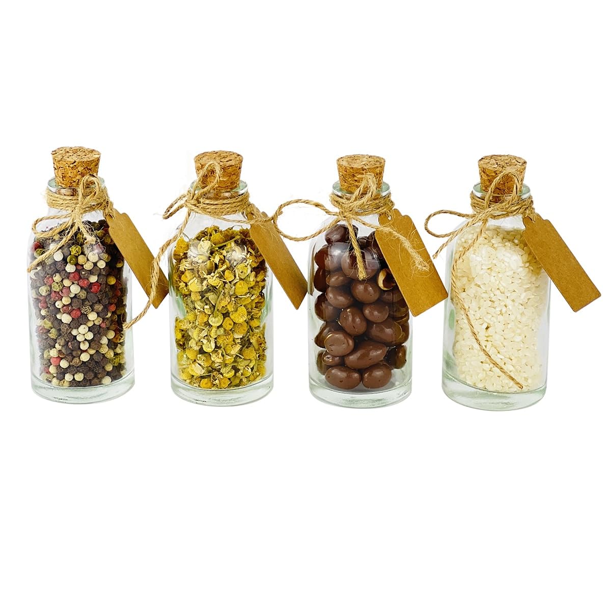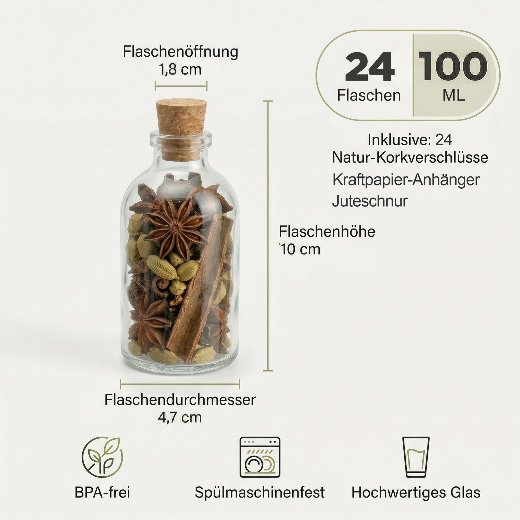 - 24 GLASFLASCHEN 100 ML MIT KORKEN IM KOMPLETTSET – Sie erhalten 24 kleine Glasflaschen (100 ml), passende Naturkorken, dekorative Etiketten-Schildchen und Jute-Schnur. Maße pro Flasche: 10,0 cm hoch, 4,7 cm Durchmesser, ca. 100 g. Der konische Korken sitzt fest und dichtet zuverlässig ab.
