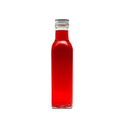 Die 250 ml Glasflasche Maraska bietet eine stabile, eckige Form mit sicherem PP31,5 Schraubverschluss. Sie eignet sich für Likör, Öl und andere Flüssigkeiten.