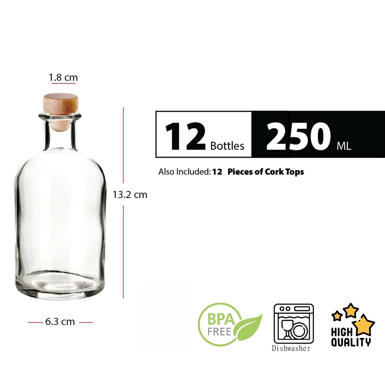 slkfactory 12 Glasflaschen 250ml Leere Likörflaschen 250 ml Apothekerflasche 0,25l mit Griffkorken zum Befüllen Kleine Glas Flasche Korken Öl Essig Likör Geschenk Weihnachten